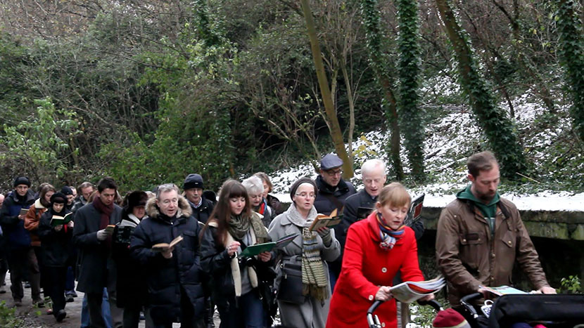 A procession on a disused railway track reading books about trains. A reading list was compiled.
