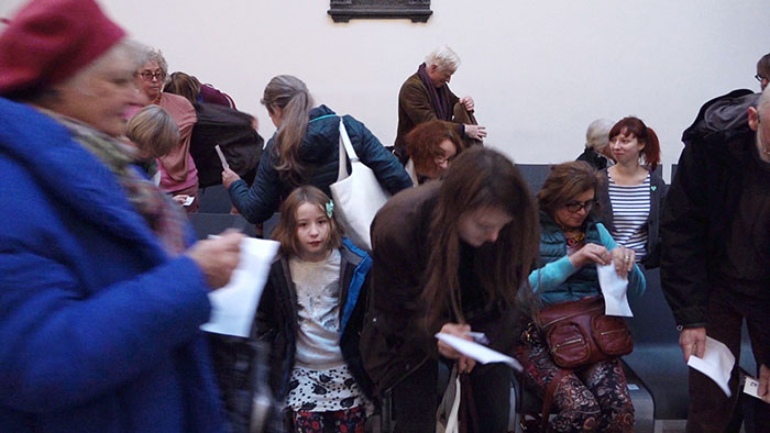 Participants were asked to 'take their seats' for a concert. Pre-recorded sound tracks - quiet conversation and the orchestra tuning up - set the scene. Several people were late in arriving. Finally participants joined in polite applause as the conductor walked on stage and the lights dimmed.