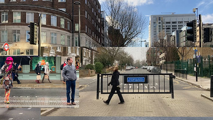 Plan A was to cross the road, as a socially distanced group, wearing unusual hats, masks and winter coats. Then COVID intervened…so I asked participants to cross the road where they live and send me their videos. These have all gone into a base video filmed with my phone at the original location. The resulting work shows surprising synchronicity and unlikely encounters. Videos came from ENGLAND; SWEDEN; USA; FRANCE; SCOTLAND and TAIWAN.
