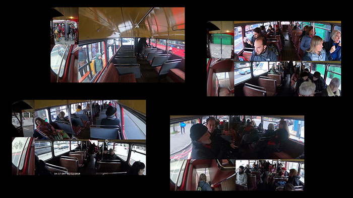 ALL CHANGE recorded a bus journey around North London on a Routemaster Bus (RM 5 - the first bus off the production line in 1959). It was filmed with GoPros, positioned where one would find security cameras on a contemporary bus. Segments of the journey have been arranged for this video to suggest a wall of security cameras.